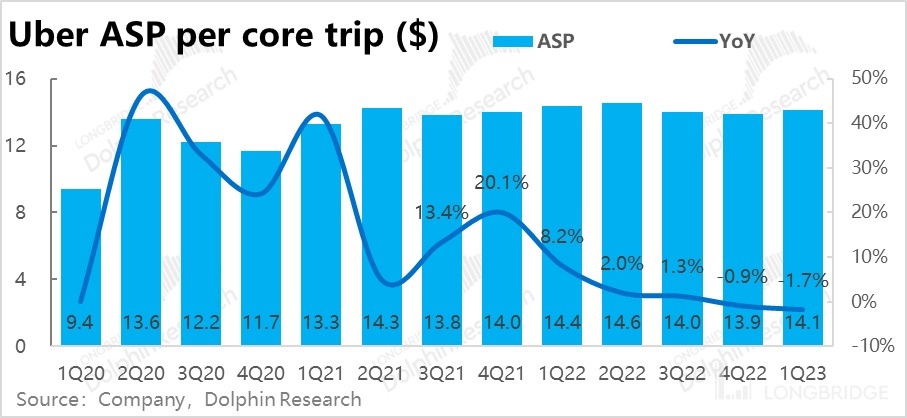 价量驱动因素拆解来看,价的角度上一季度核心订单(包括打车和外卖)的平均客单价为 14.1 美元,虽由于高基数同比下降了 1.7%,但实际仍处于较高水平,同样尚未反映出需求减退的迹象。
