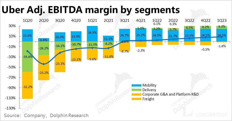 同时,海豚君一直认为 to B 的货运业务和公司核心的 to C 业务间协调效应较低,且货代生意的利润空间也较薄,因此不太看好 Uber 货运板块的前景。而近期公司也声称有把货运业务剥离,或单独上市的打算。对此选择,海豚君持赞同意见,也能帮助公司更专注于核心板块,并减少由货运板块带来的亏损。