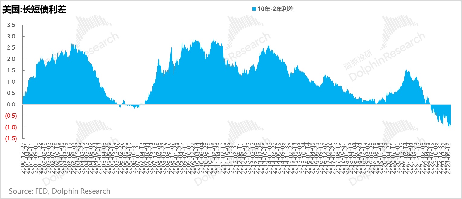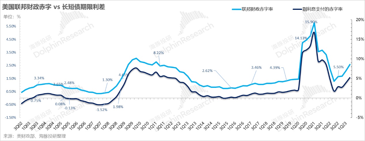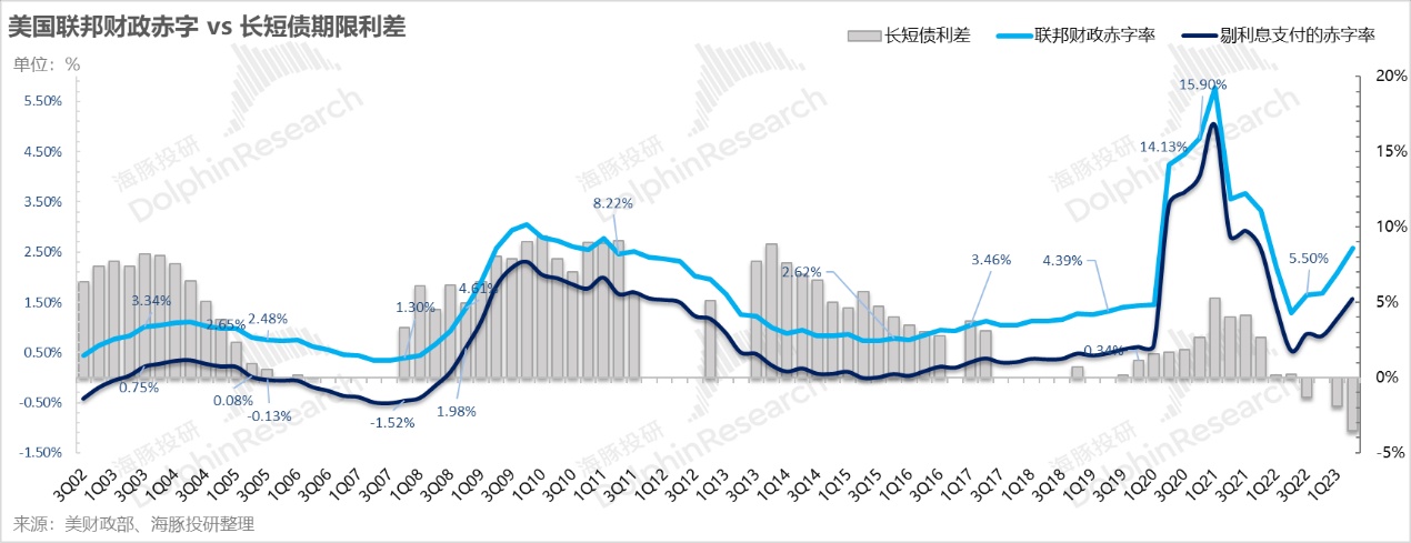 正常经济环境下,一般联邦赤字率高升期,长短债利差拉大;由于短期利率高度锚定美联储政策利率,利差拉大本质是长端收益率走高。而当前长端利差倒挂的情况下,其实就是倒挂缩窄。