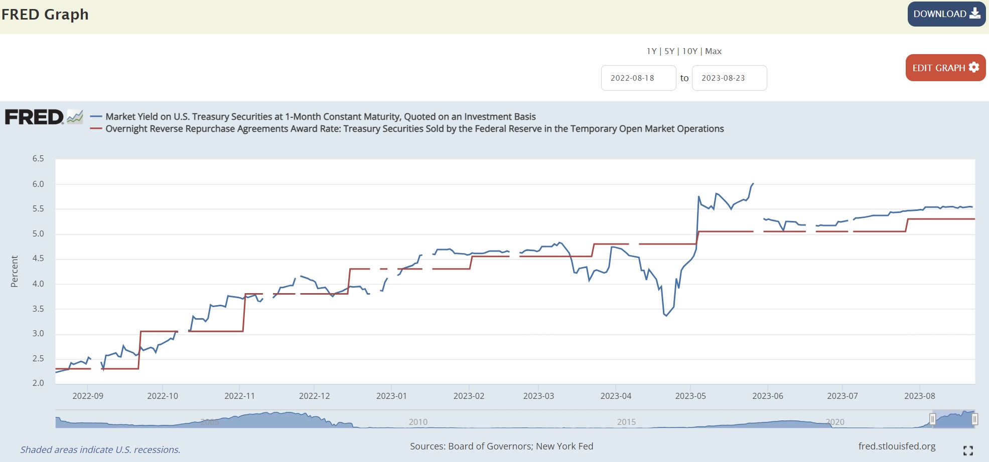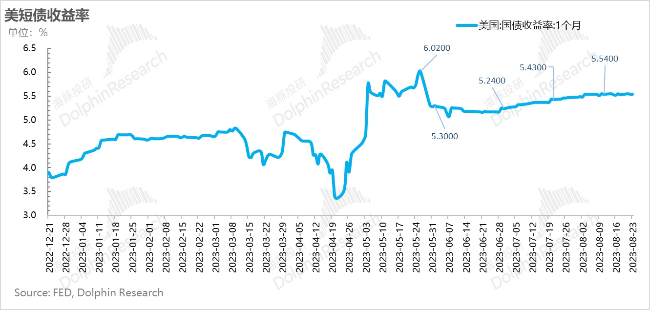 B)但好巧不巧,今年 5 月以来,美国短债利率持续高于隔夜逆回购利率:用低利率的隔离逆回购的资金来买利率稍高的短债,利率价差上算的过来。