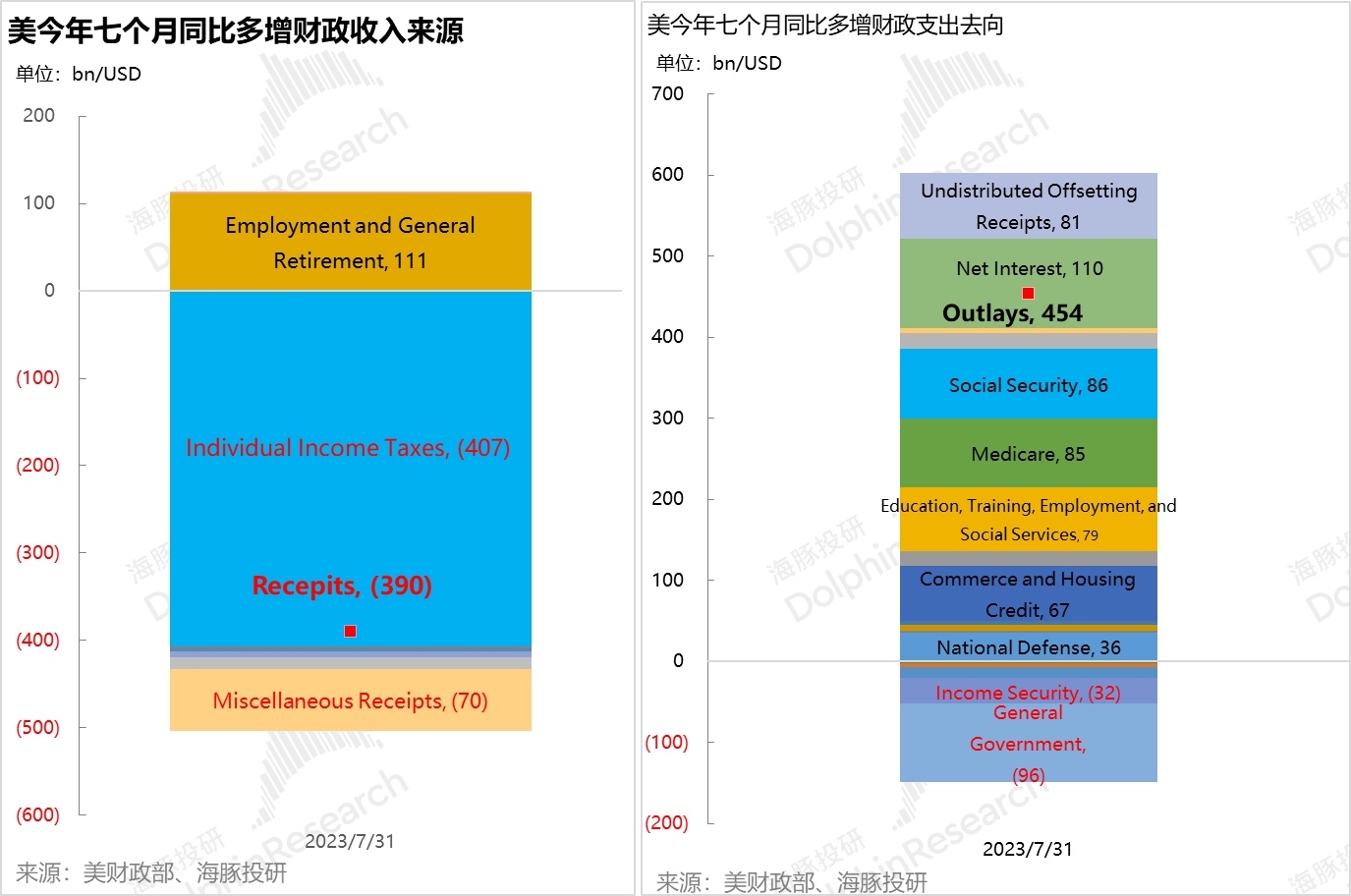 收入端:今年前七个月,个人所得税比去年同期减少了 4000 亿,可能和个人股权账户收益比较高有关;雇佣和退休相关的增加了 1110 亿,印证了美国就业确实比较好;合计 1-7 月份财政收入减少了接近 4000 亿。