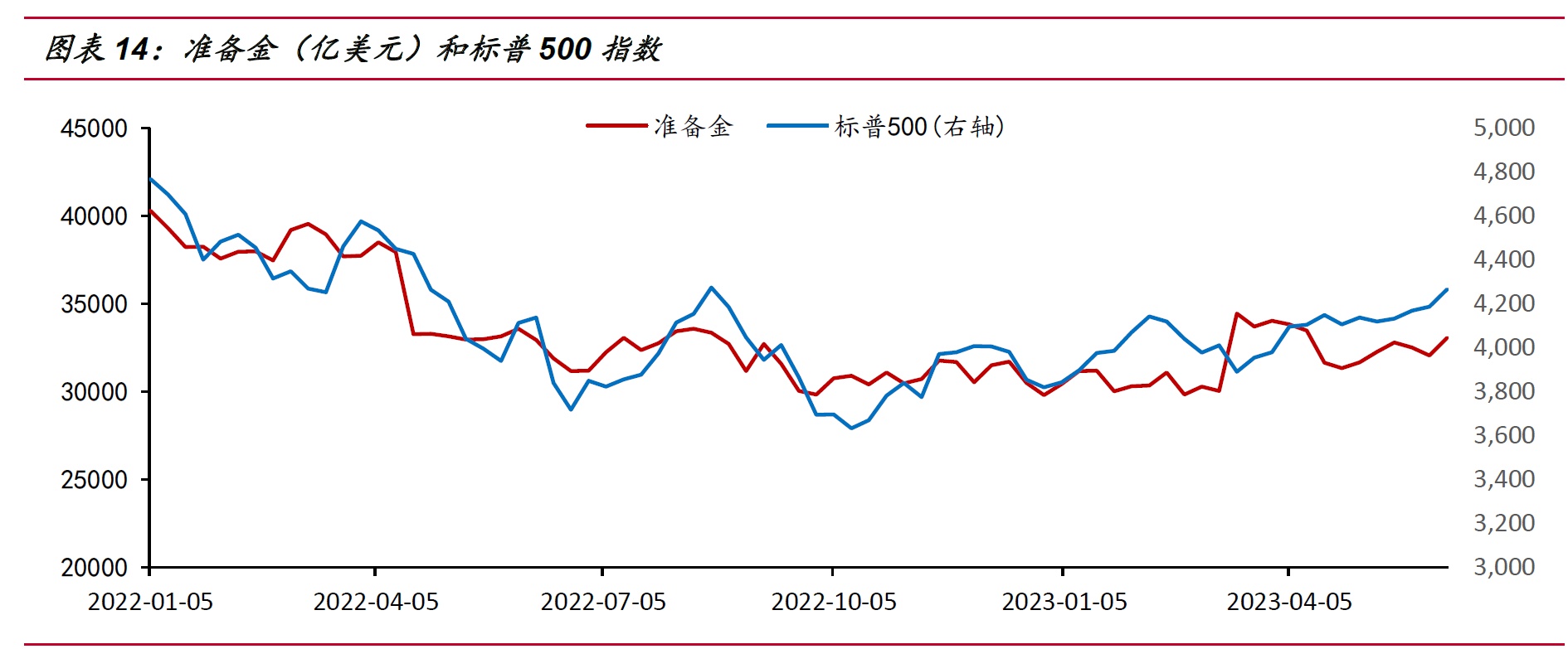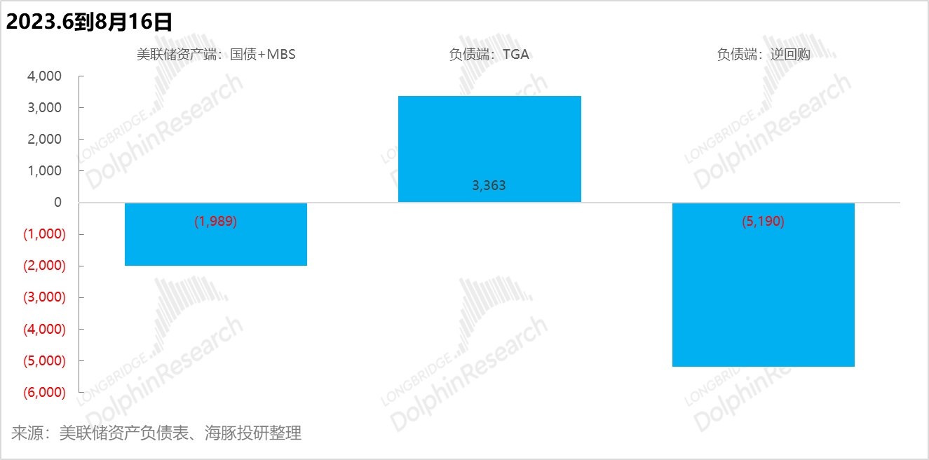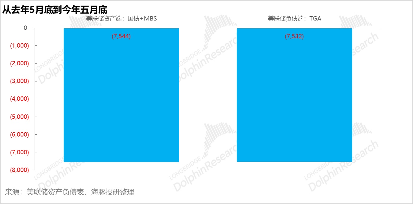 由于今年 6 月之前,美国财政上限问题一直没有解决,无法新举债,美联储资产端国债一直在抛,负债端同步减少的基本就是 TGA 账户资金。