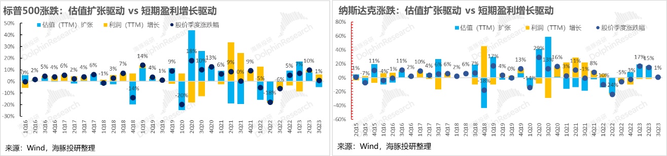 但美股,尤其是科技股为主,比如说特斯拉、微软今年以来 EPS 并无明显扩张,只是没有出现预期中的下行,涨幅基本全部由估值贡献,甚至英伟达这种公司,也是 EPS 和估值双击状态。且进入三季度持续回调之后,目前两大市场的估值分位仍在过去五年 60-70% 的分位上。