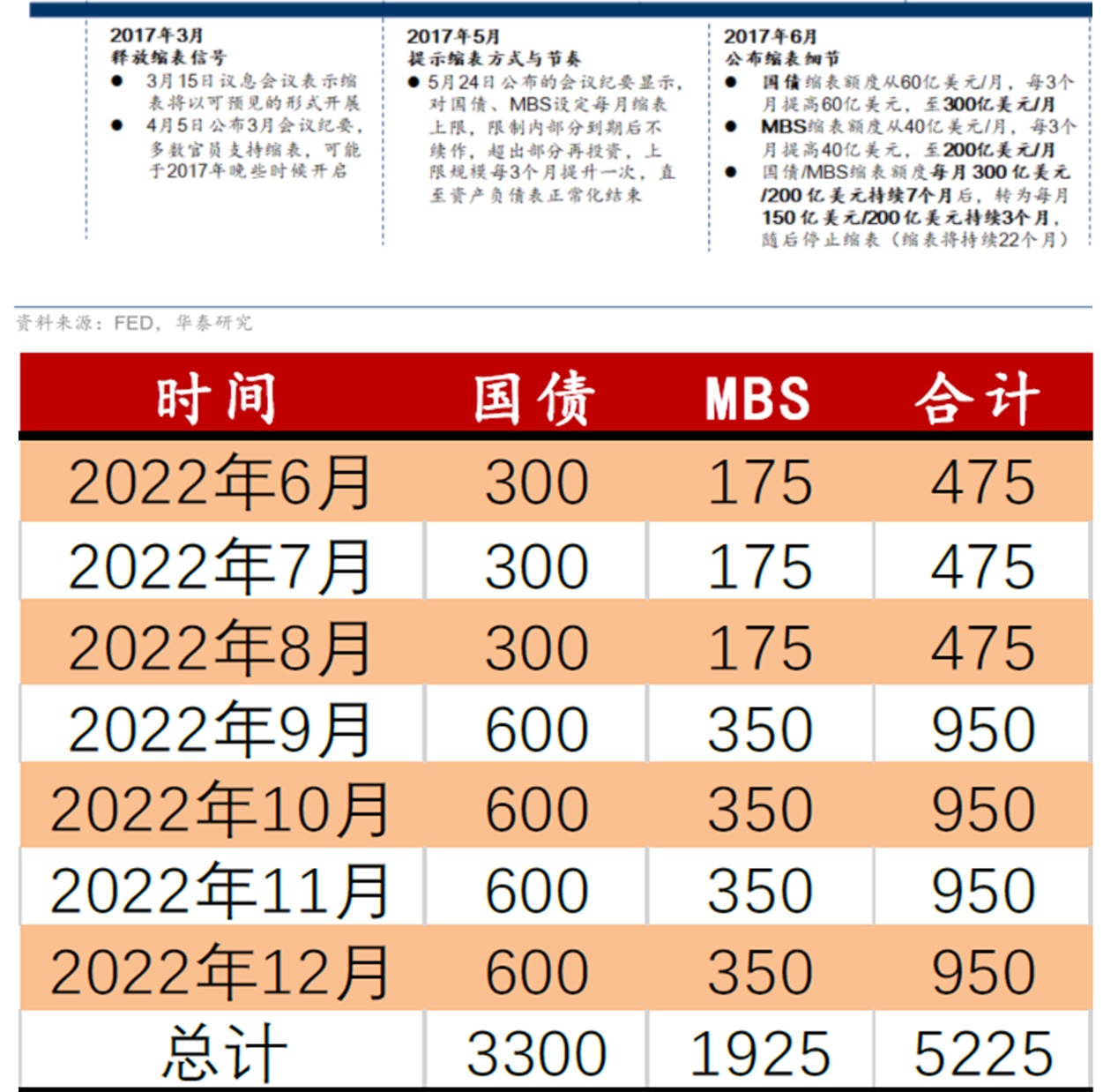 但货币政策量的维度上,虽然美联储早已经公布了量化紧缩的节奏:2022 年 6 月开始缩表,前三个月缩表 475 亿美金,后面开始每个月缩表 950 亿美金,其中国债 600 亿,MBS 350 亿。