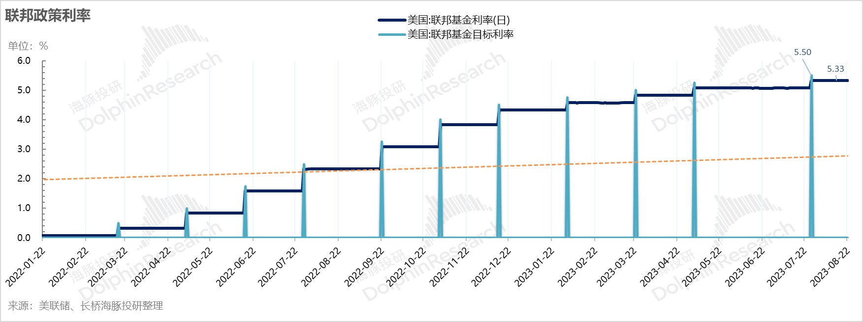 2022 年 3 月开始启动加息,到现在为止,美联储已经连续加息了 11 次,把联邦基础利率从 0-0.25% 拉到了 5.25% 到 5.5%。