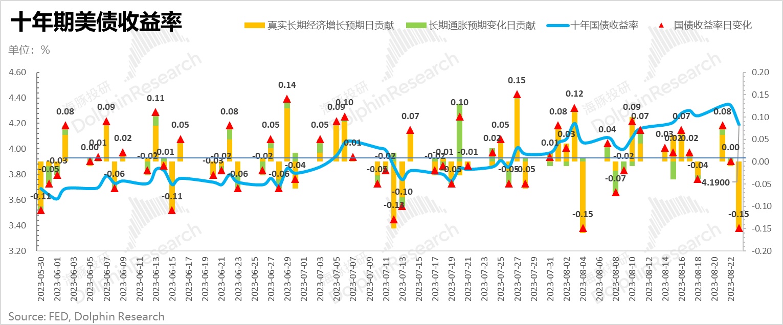 海豚君这里借用行业一个粗略估算:假如中长期通胀中枢 3%(而非美联储预期的 2%),疫情前实际利率 0.5%,以后 1.0-1.5%,加大通常是几十个基点的期限溢价,长端利率理论上达到4.5% 上下也说得过去,而目前在 4-4.3% 之间已经快到上限了。